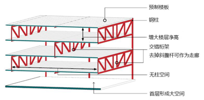 是指以預(yù)制鋼筋混凝土柱或鋼柱、鋼桁架、預(yù)制樓板等預(yù)制構(gòu)件組成的大跨度空間結(jié)構(gòu),主體結(jié)構(gòu)采用裝配式交錯(cuò)桁架結(jié)構(gòu),配置外墻、內(nèi)隔墻和樓蓋系統(tǒng)的建筑。